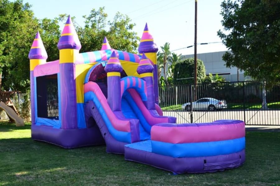 This front loader combo features a 6ft. high waterslide with bounce area and basketball hoop.