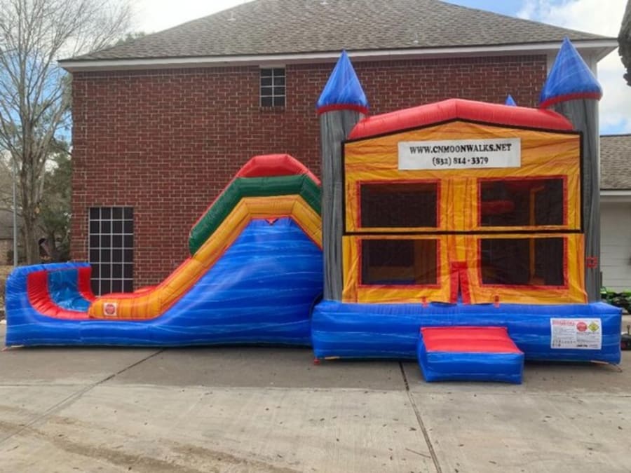 This waterslide features a 11x11 bounce area with a basketball hoop, popup pillars and large slide with a stopper.