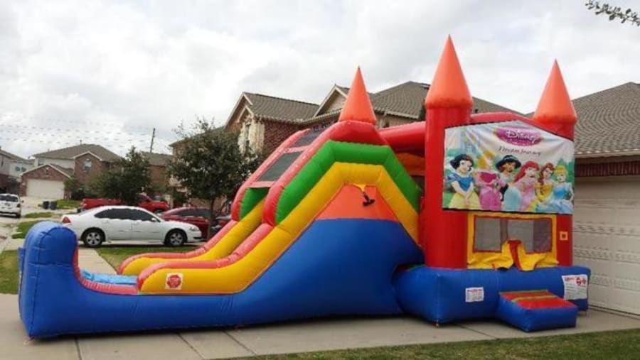 This model features an 11x11 bounce area with a ladder on one side ending in a waterslide. You can also add a themed banner to this model.