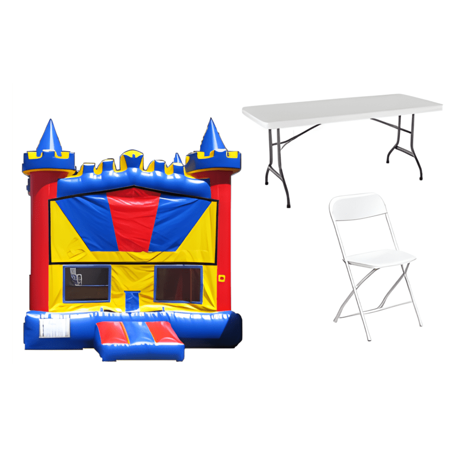 Royal Castle (2) 6 ft. rectangular tables (16) white plastic foldable chairs